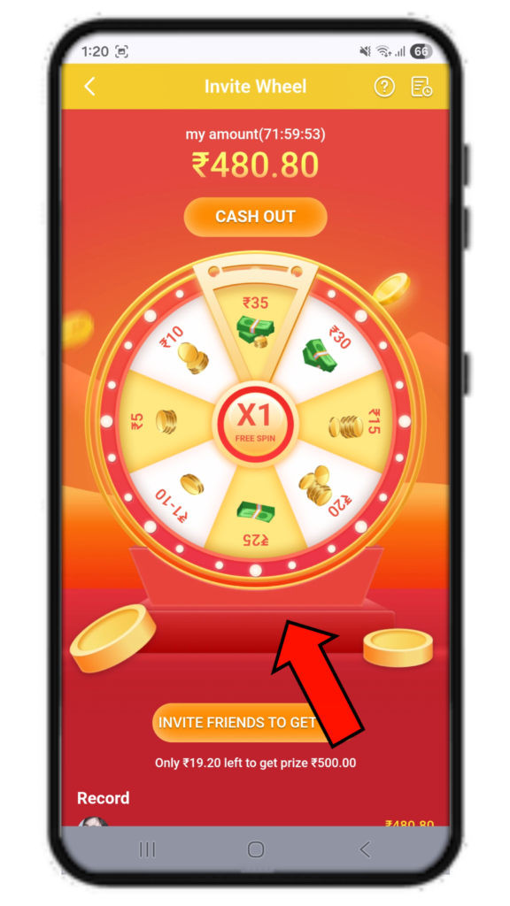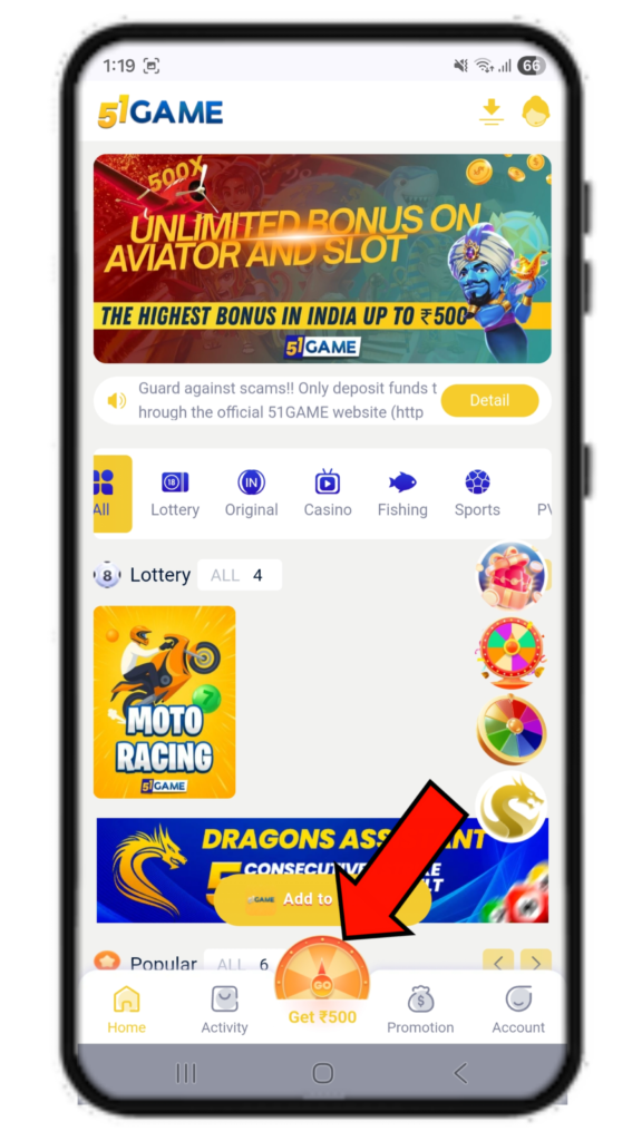 On the home screen, look for "Get ₹500 Bonus!". Just tap it to spin the wheel and claim your bonus! 🎉